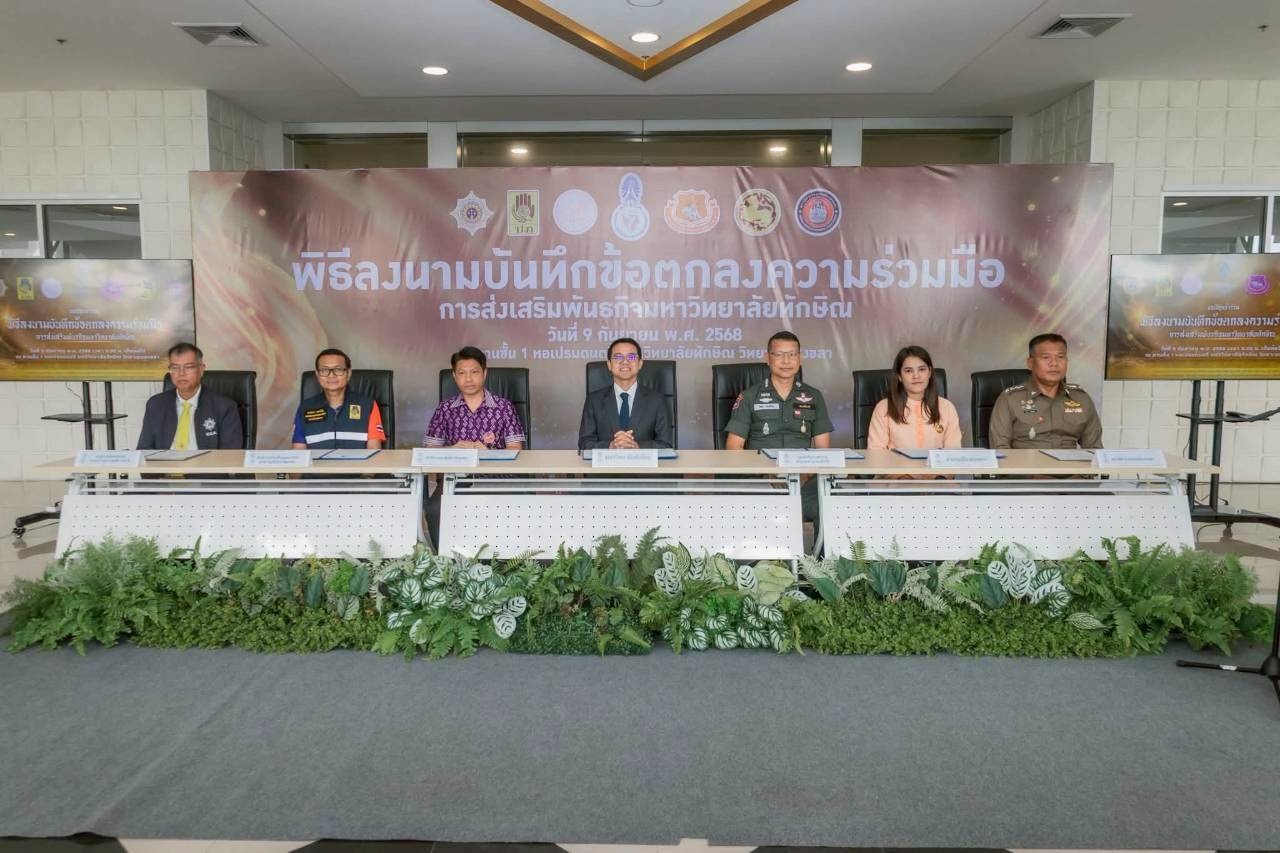 โครงการลงนามข้อตกลงความร่วมมือการส่งเสริมพันธกิจมหาวิทยาลัยทักษิณ วันที่ 9 กันยายน พ.ศ. 2568 ณ หอเปรมดนตรี มหาวิทยาลัยทักษิณ วิทยาเขตสงขลา