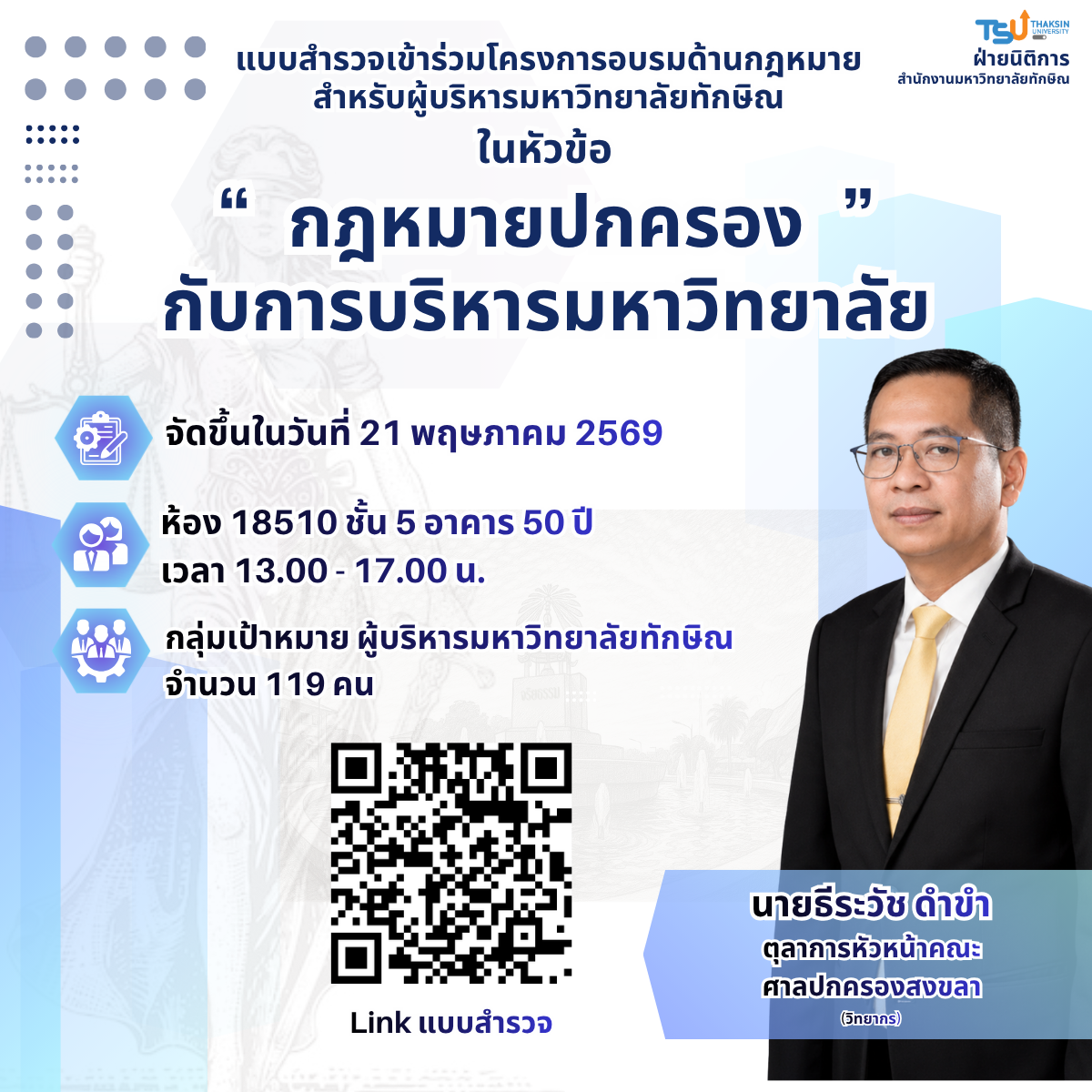 โครงการอบรมด้านกฎหมายสำหรับผู้บริหารมหาวิทยาลัยทักษิณ หัวข้อ "กฎหมายปกครองกับการบริหารมหาวิทยาลัย"